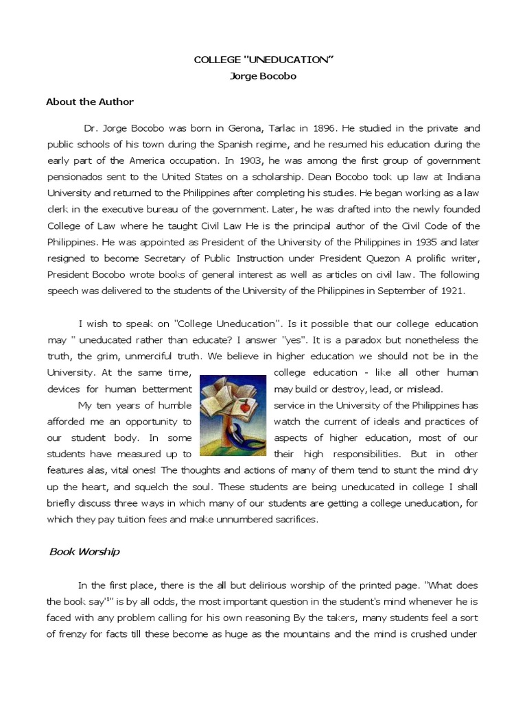 Jul 25, · JORGE BOCOBO Drafted speeches for Pres. Quezon and advocated Philippine Independence Filipino culture and tradition should be the basis of a truly Filipino Education He equated education with patriotism and nationalism and believed that the Stressed that the education in this country should prepare the child for democratic way of life.5/5 Paganism in the College Education An Essay By Jorge Bocobo Summary Anglo-Saxon period can be easily represented with the lyric poem "The Seafarer". I decided to tease her a bit because she was never that polite about coming into my room when I was only in my boxers. Within the realm of philosophy, the works of Herbert Spencer were of Jorge Bocobo “To my humble way of thinking, education has for its supreme and overshadowing aim the formulation of a sound and noble outlook of life.” 5. Camilo Osias “ Education must secure freedom, efficiency, and happiness for all people. 6. Rafael Palma “ Education must produce individuals who are both useful to themselves and to society